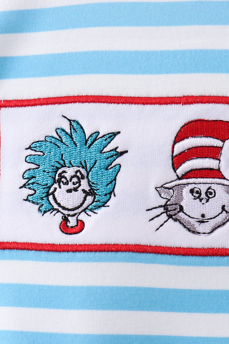 Meet the perfect playdate companion! This charming romper features vibrant blue stripes paired with delightful character embroidery that'll have little ones grinning from ear to ear. The relaxed fit ensures all-day comfort for crawling, playing, and exploring, while the classic stripe pattern keeps things timeless and versatile. Easy to dress up or down, it's an instant favorite for casual outings or cozy days at home. Simple, sweet, and oh-so-fun!