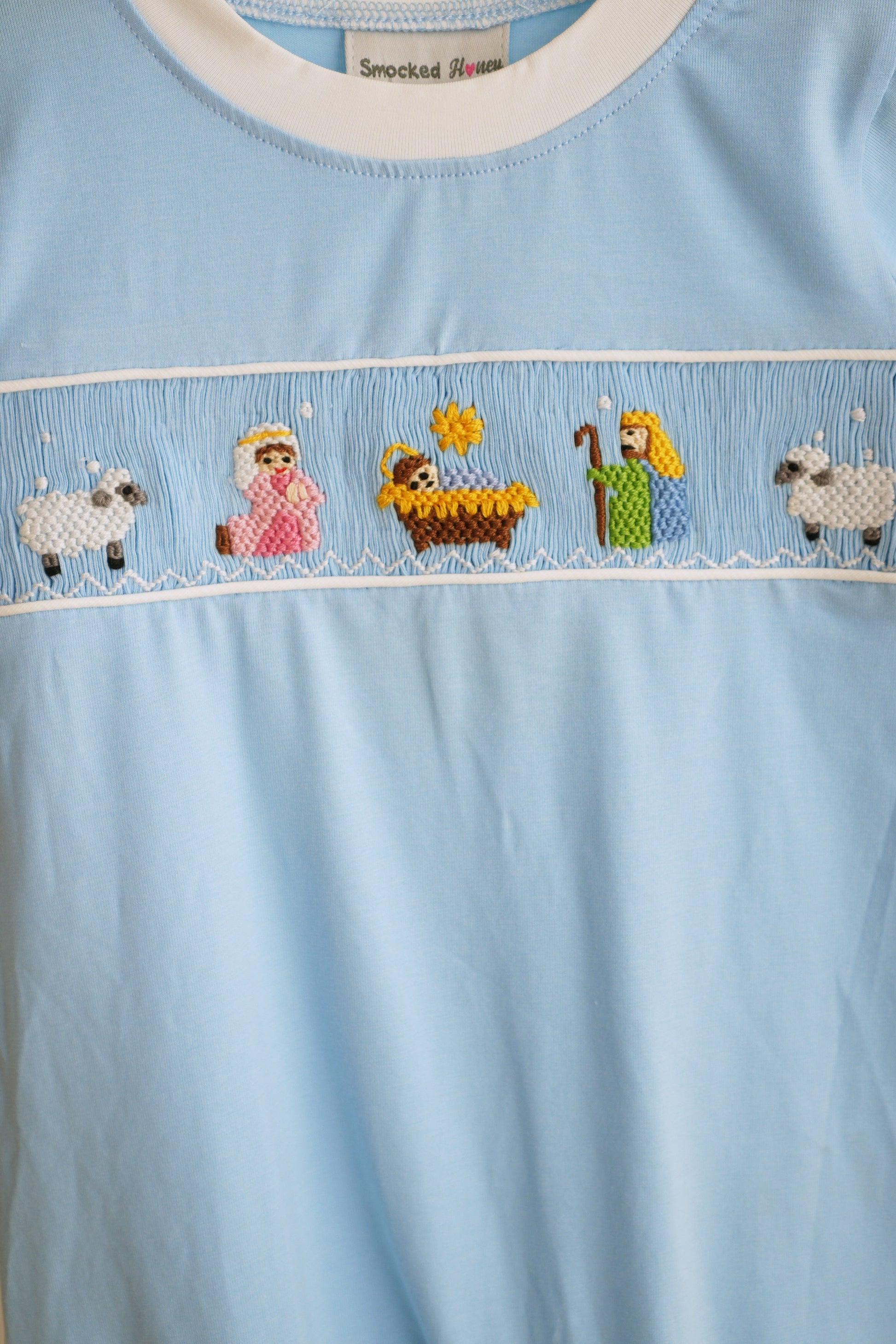 Dress your little one in holiday magic with this charming blue nativity hand-smocked romper. Featuring delicate hand-smocking details that showcase traditional craftsmanship, this one-piece wonder combines comfort with festive style. The soft blue hue pairs perfectly with nativity-inspired design elements, making it ideal for holiday celebrations, family photos, or special occasions. Gentle on delicate skin and designed for easy dressing, this romper is a timeless piece that captures the wonder of the season.