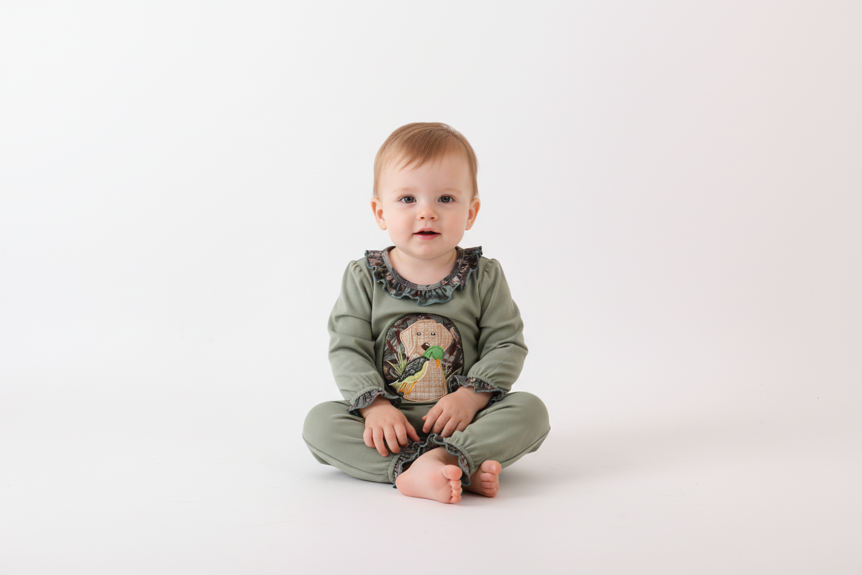 This playful romper features a charming camouflage print with a cute dog hunting applique, perfect for your little adventurer. The ruffle details add a fun, flirty touch, making it ideal for outdoor play or casual days. Comfortable and stylish, it’s ready for any little explorer’s next adventure!